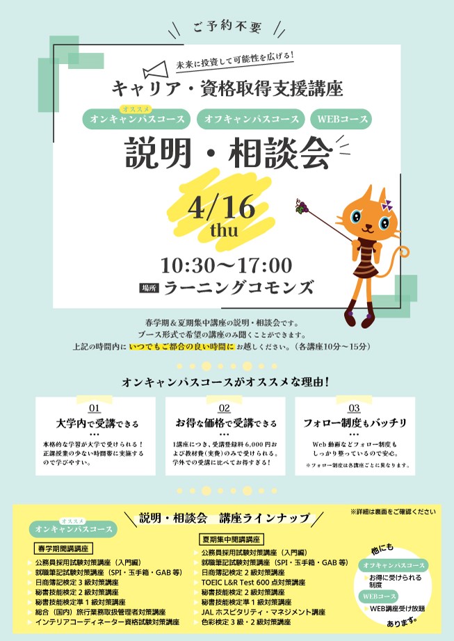 春学期申込/夏期集中講座の相談会です。