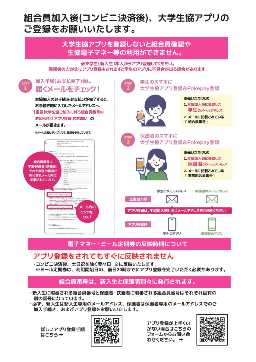 重要!!生協加入手続きが終わってから学生ご本人が大学生協アプリをダウンロード・登録をお願いします。大学生協アプリ登録手順