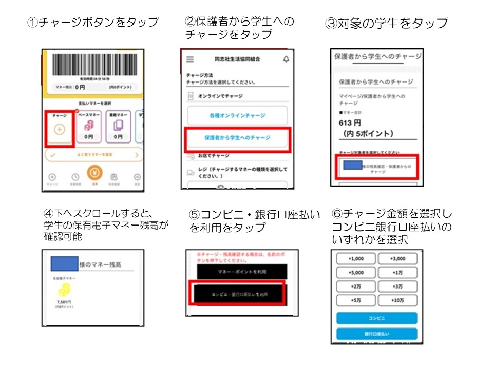 保護者様からの学生へのチャージ方法、学生の残高確認方法