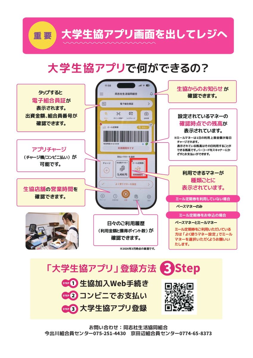 大学生協アプリ問い合わせフォームエラーが解消されない場合は上記の問い合わせフォームより問い合わせください。大学生協アプリにて電子組合員証と一体となった、便利、安心、簡単、お得な電子マネーです。同志社生協の組合員の方はどなたでもご利用いただけます(利用料はかかりません)。生協電子マネーを使用していただくには「univcoop マイポータルの登録」が必要になります。