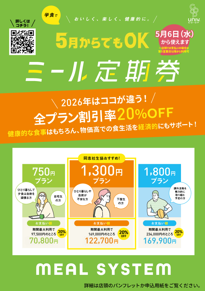 1年分の食費を前払い頂くことでお得に生協食堂・生協ショップ(コンビニ)をご利用いただけます。