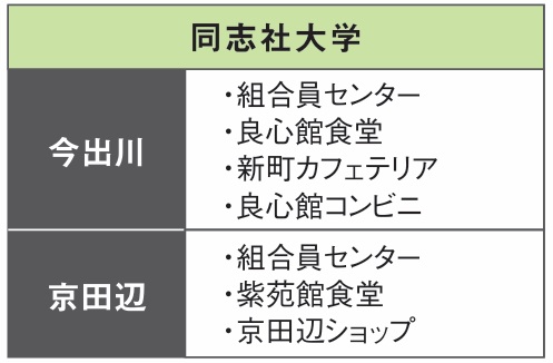 食堂だけでなく、同志社大学、同志社女子大学の生協食堂、生協ショップ(コンビニ)で利用頂けます。
