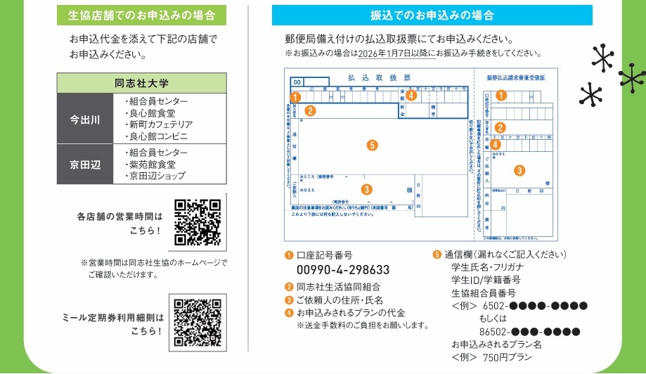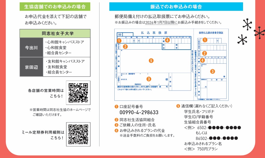 下記の生協店舗もしくは郵便局での振込でお申し込みができます。①生協でのお申込みの場合