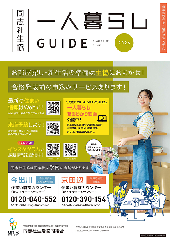 同志社大学・同志社女子大学から委託を受け36年。学内でお部屋探しができます。