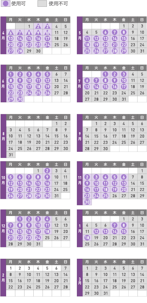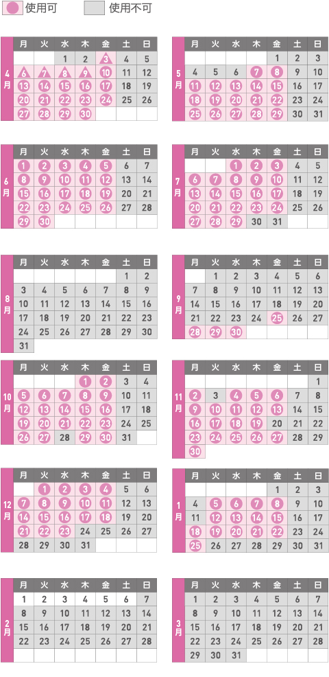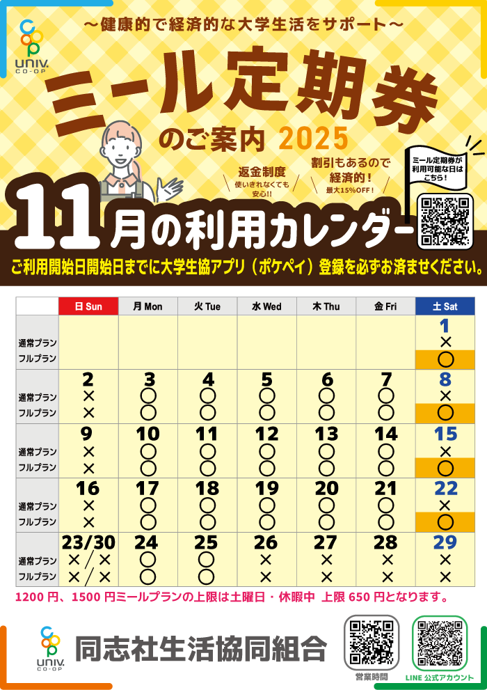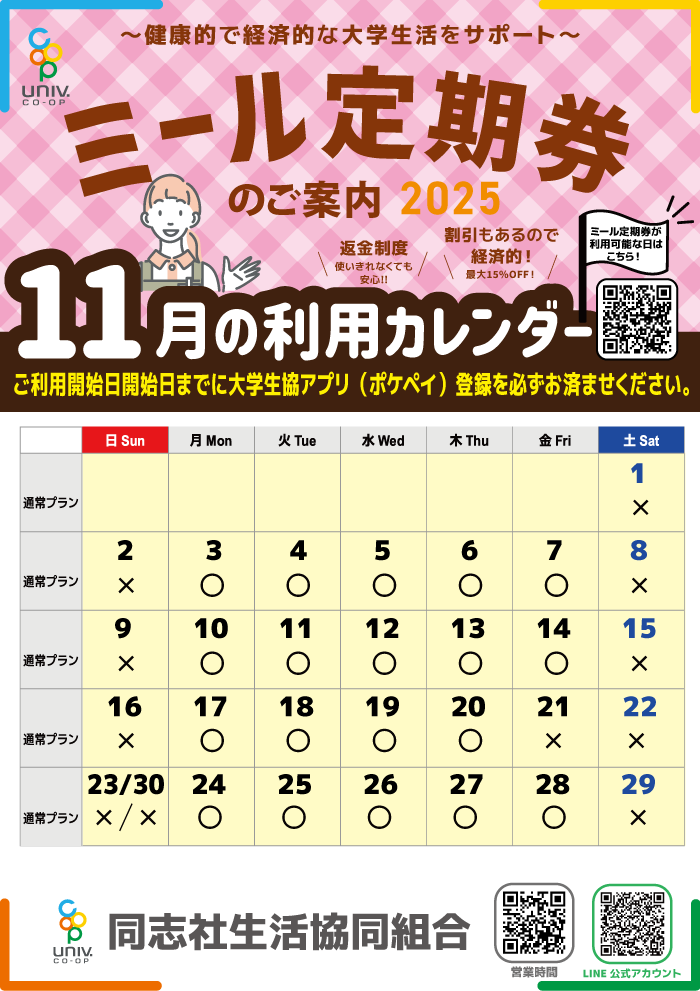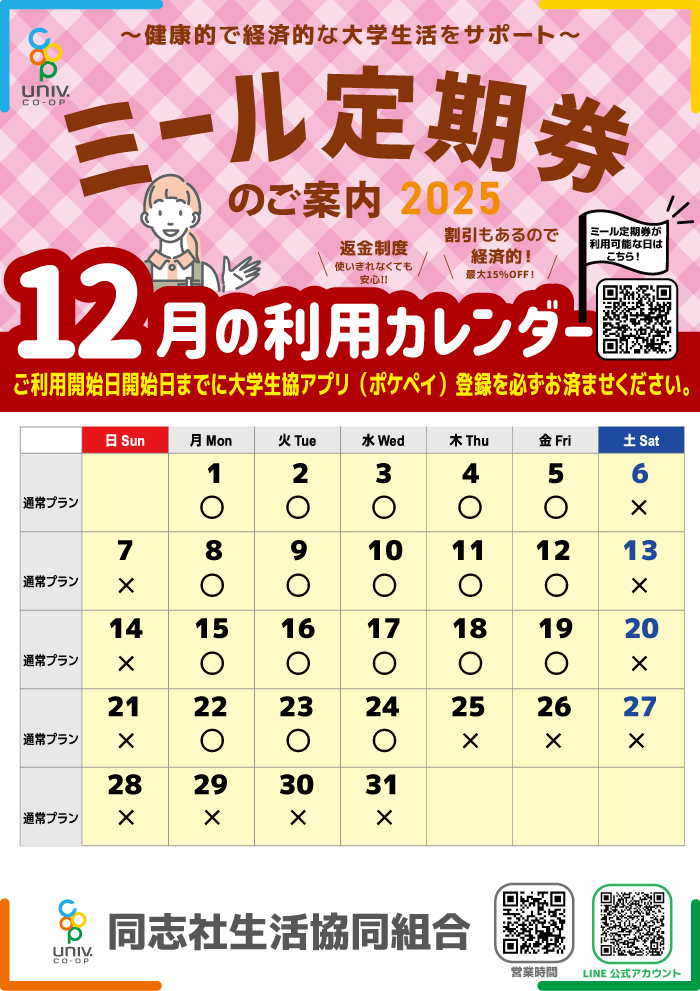 ※祝日などの変動により、授業日やミール定期券の利用可能日が変更になる場合があります。