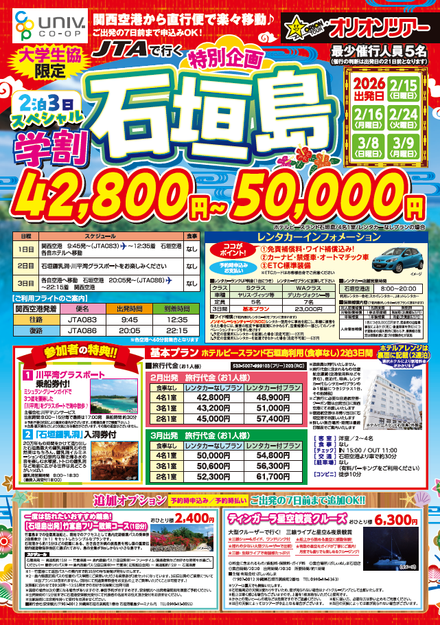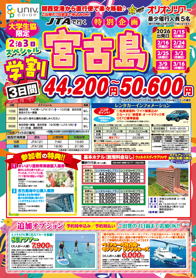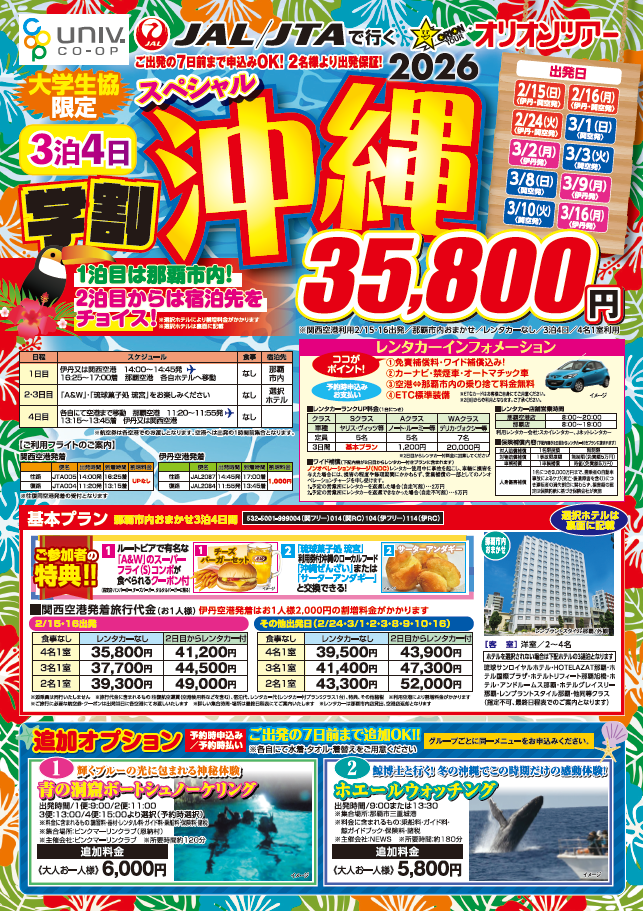 大学生協では、大学生協レンタカープランで特別価格での手配をしています。