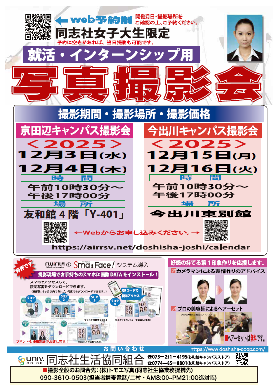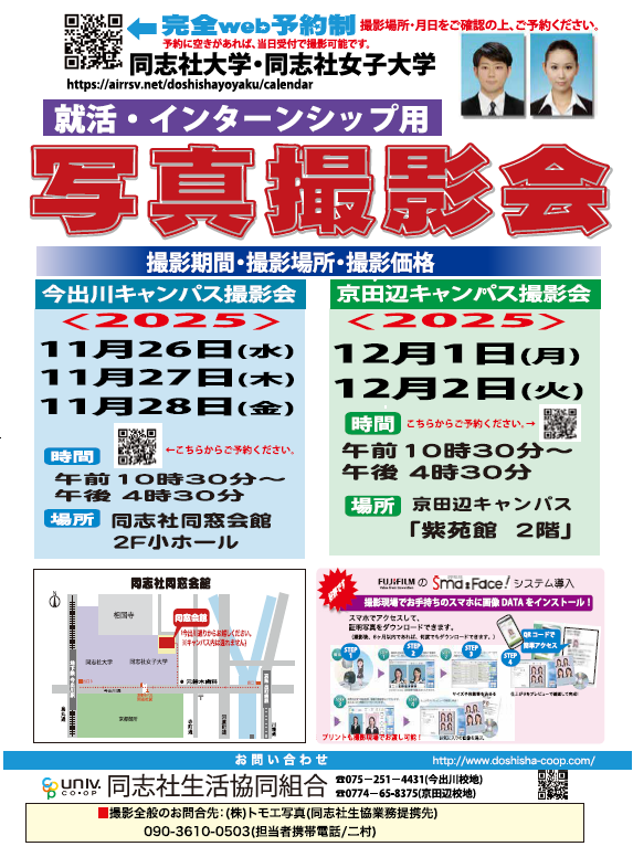 | 同志社大学 | 今出川 | 組合員センター | 良心館地下1階 | 075-251-4430 |