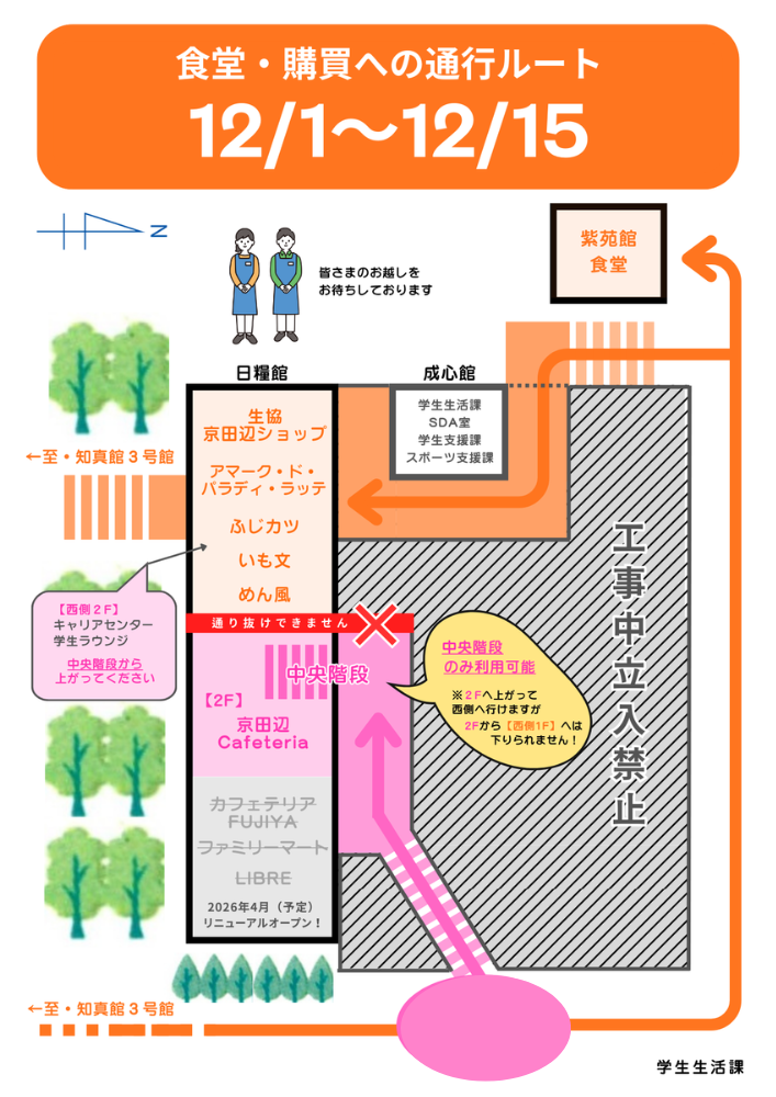 【同志社大学 京田辺校地の方】12/1~食堂・購買への通行ルート