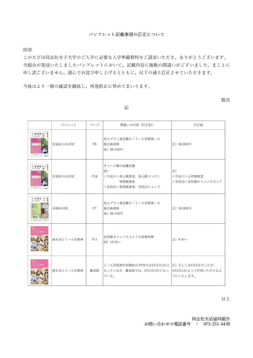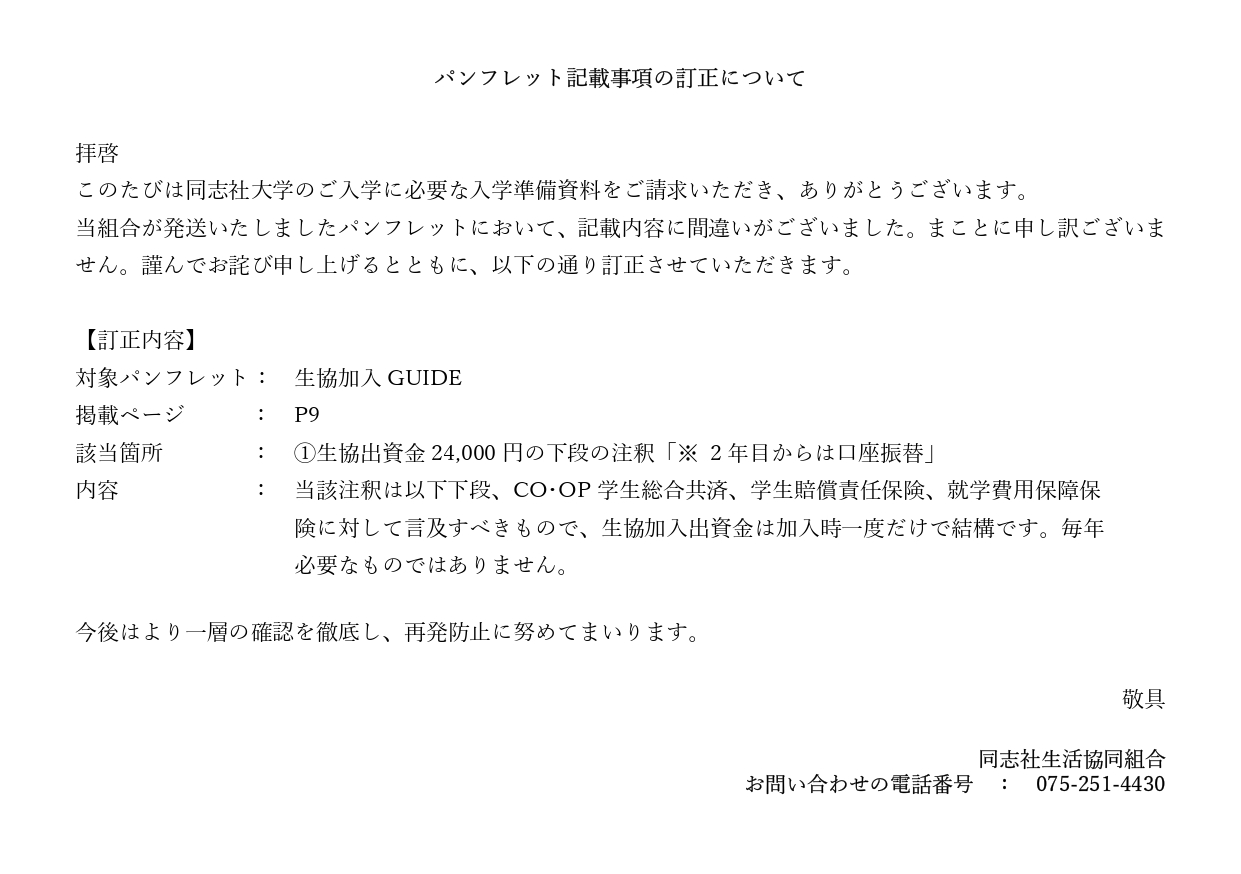 【パンフレット正誤表】同志社生協へ資料請求頂いた方